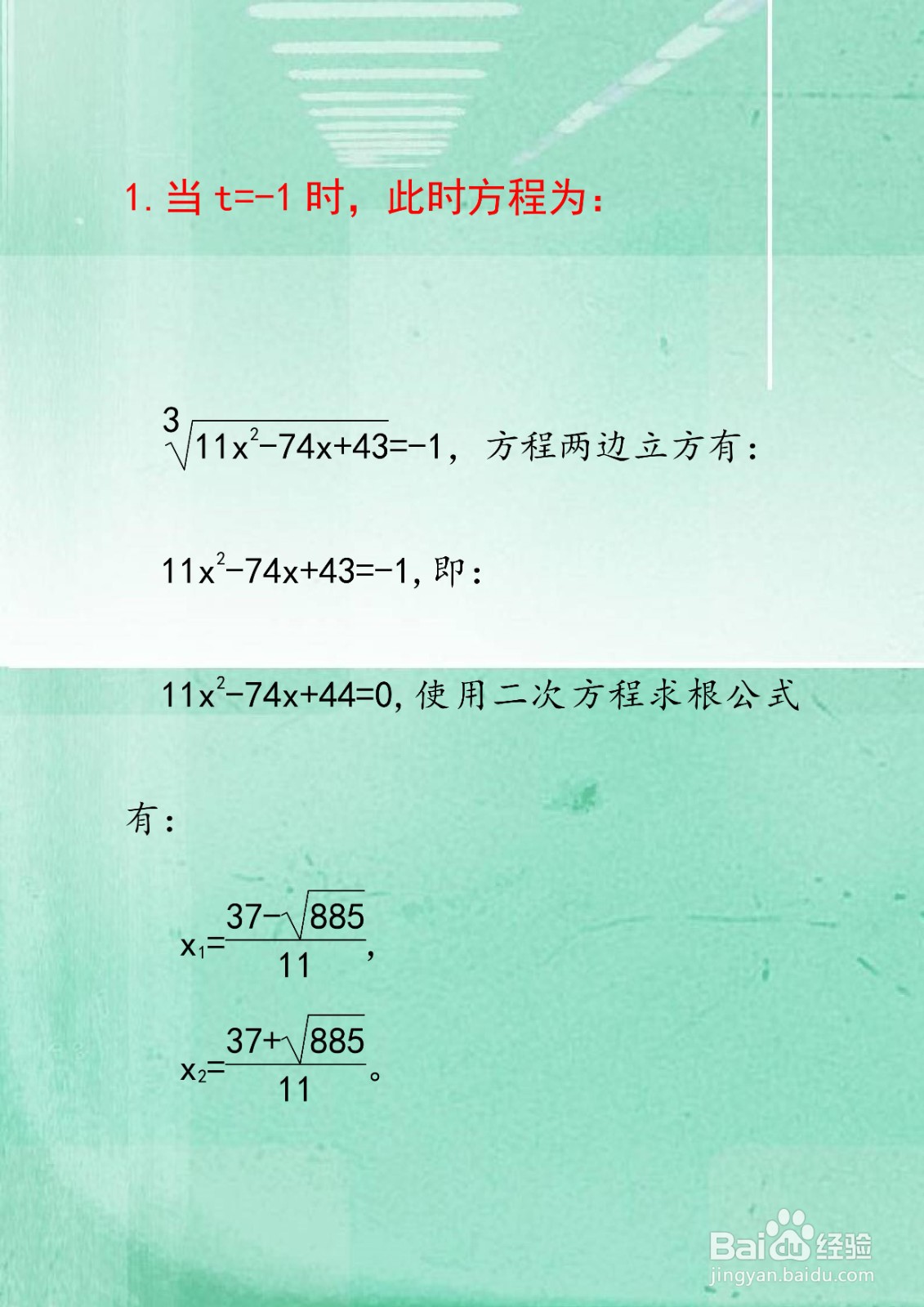 2、当t=-1时,此时方程为:3√(11x^2-74x+43)=-1,方程两边立方有:11x^2-74x+43=-1,即:11x^2-74x+44=0,使用二次方程求根公式有:x1=(37-√885)/ 11,x2=(37+√885)/ 11。